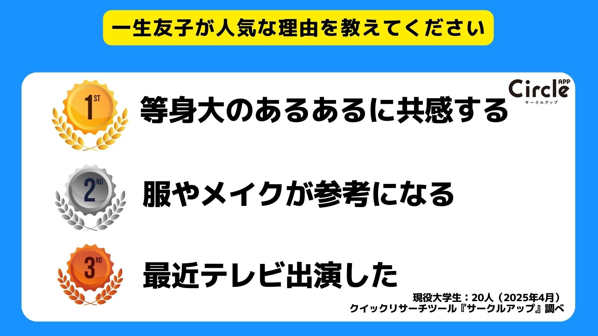 同様に票を集めた「一生友子」について、アンケートで投票した学生にその魅力を聞いたところ、「等身大のあるあるが同世代には共感できる」、「服やメイクの動画は参考になる」といった声が多く寄せられました。また昨年にはテレビ番組「マツコ会議」にも出演し、その人気は全国区に。