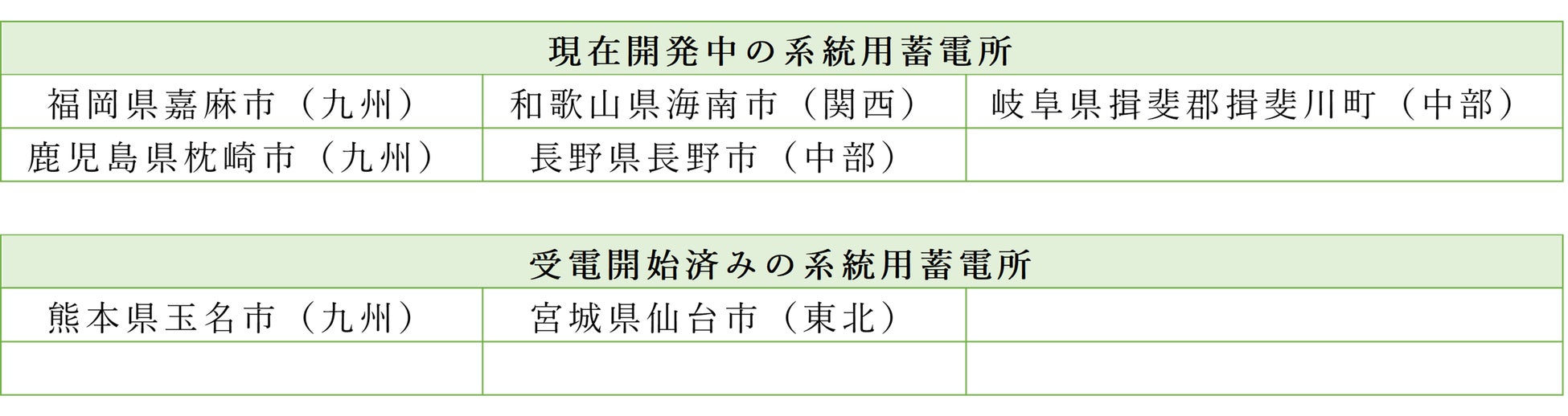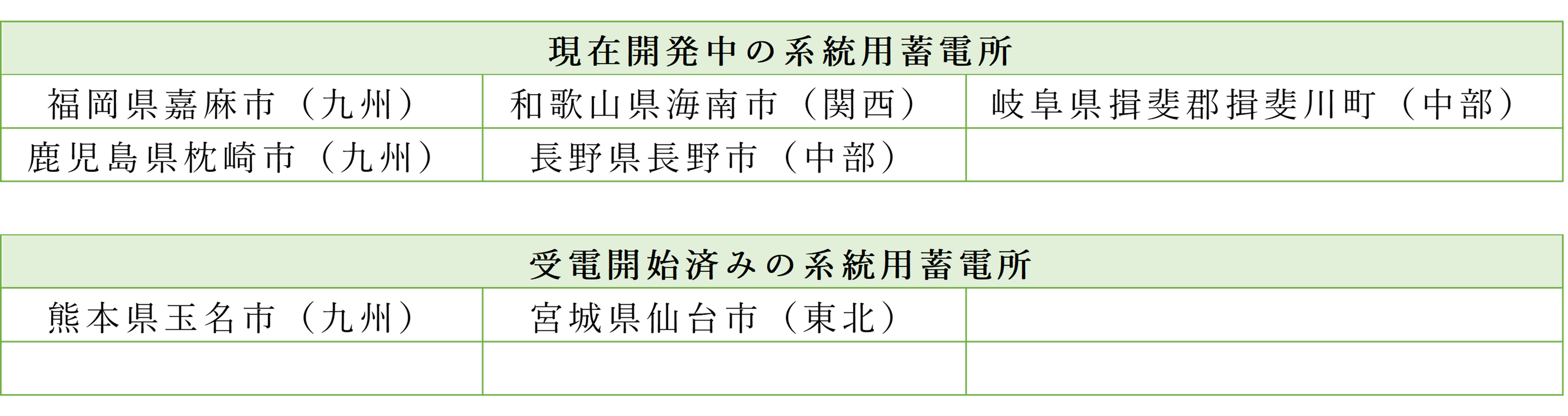 直近で受電開始を控えている系統用蓄電所につきましては、福岡県嘉麻市の系統用蓄電所が2026年6月、和歌山県海南市の系統用蓄電所が同年9月を見込んでいます。各蓄電所の進捗につきましては、確定次第、改めてお知らせいたします。