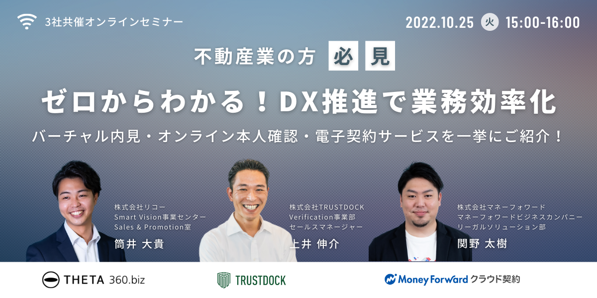 TRUSTDOCK × リコー × マネーフォワード、不動産業の方向けに「ゼロからわかる!DX推進で業務効率化。バーチャル内見・オンライン本人確認・電子契約サービスを一挙にご紹介!」ウェビナーを開催