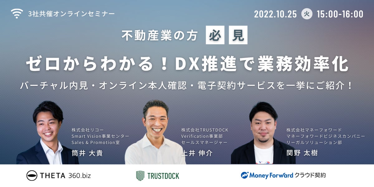 株式会社TRUSTDOCK(本社:東京都千代田区、代表取締役:千葉 孝浩、以下TRUSTDOCK)は、株式会社リコー(本社:東京都大田区、社長執行役員:山下 良則、以下リコー)と株式会社マネーフォワード(本社:東京都港区、代表取締役社長 CEO:辻 庸介)と共催し、不動産業の方向けに無料ウェビナー「ゼロからわかる!DX推進で業務効率化。バーチャル内見・オンライン本人確認・電子契約サービスを一挙にご紹介!」を2022年10月25日(火)に開催いたします。