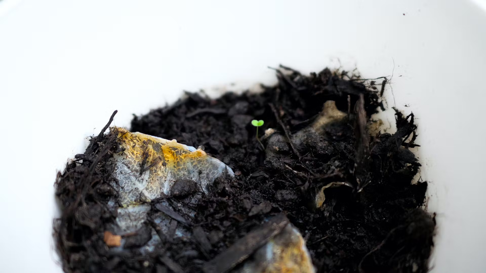 葉が記の中には植物の種が埋め込まれているため、土に入れて水をかけると、ゆっくりと時間をかけて寒天でできた葉が溶け、種だけが土に残り、芽を出します。