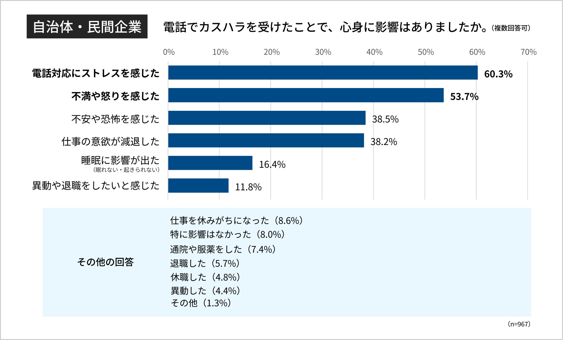 有効回答数:967(民間企業でのカスハラ経験者・・・722、自治体でのカスハラ経験者・・・245)