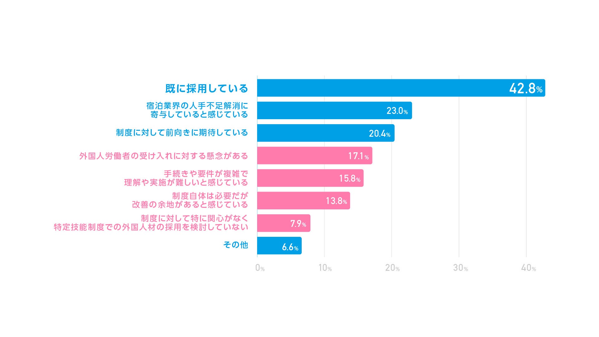 特定技能の印象について「既に採用している」が42.8%と最も多い結果となる一方で、「外国人労働者の受け入れに対する懸念がある(17.1%)」「手続きや要件が複雑で、理解や実施が難しいと感じている(15.8%)」「制度自体は必要だが、改善の余地があると感じている(13.8%)」と懸念の声も寄せられた。