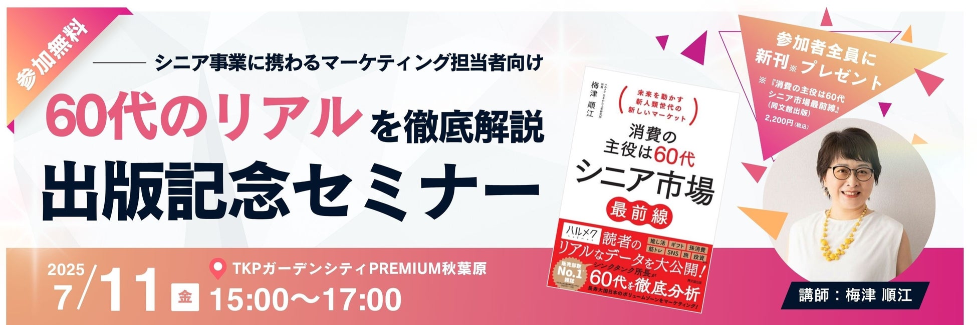 ハルメク 生きかた上手研究所 所長の梅津 順江が、『消費の主役は60代 シニア市場最前線』の出版を記念し、7月11日(金)に出版記念セミナーを開催します。