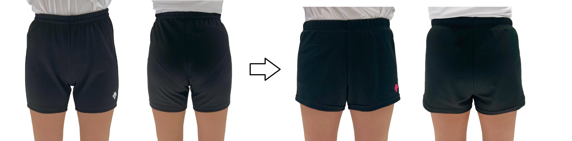 バレーボールの女性競技者層において、身体にフィットした短い丈のパンツが動きやすく人気となっています。しかし身体にフィットしたシルエットのパンツは、体形や下着のラインが目立ってしまうことも多く、前傾姿勢の多いバレーボール競技において視線が気になることが課題となっています。一方、ゆったりとしたシルエットではパンツの隙間から下着が見えてしまうこともあるため、インナースパッツを着用している選手も多いのが実情です。