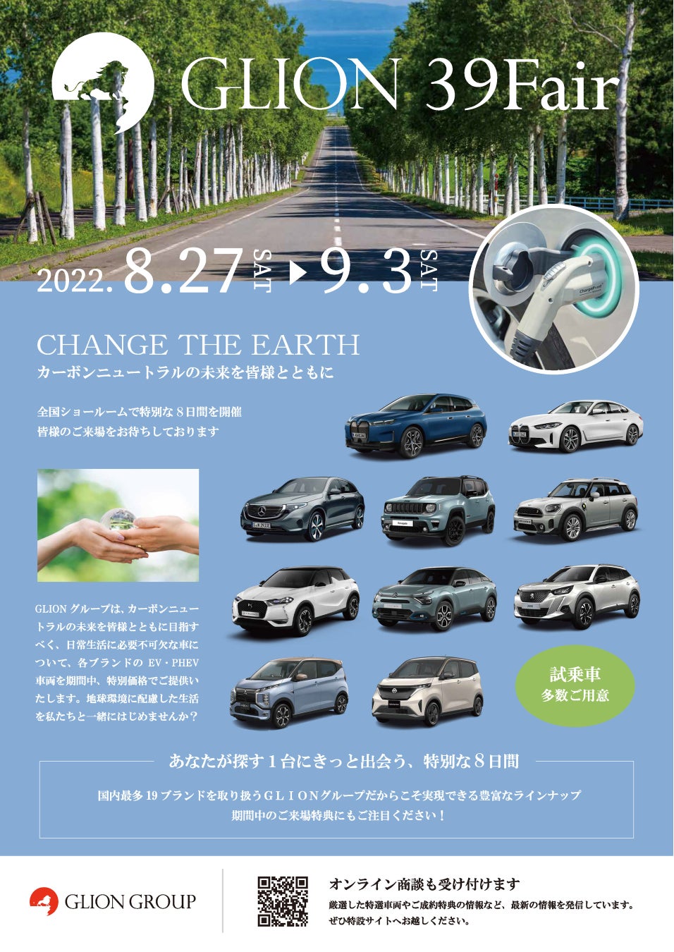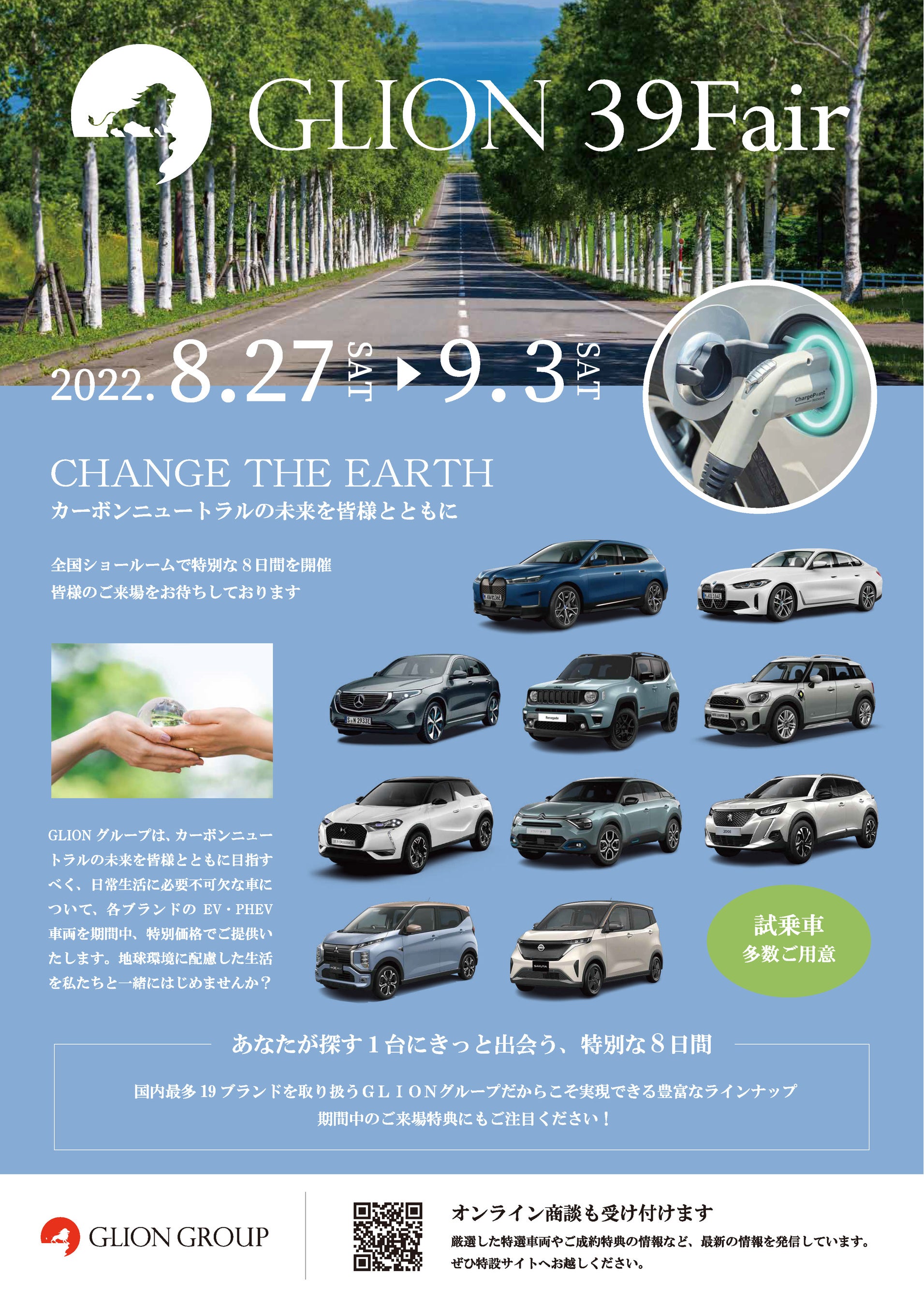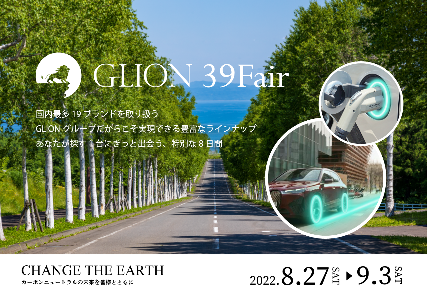 GLIONグループ(ジーライオングループ 所在地:兵庫県神戸市)では明日から9月3日(土)までの8日間、各店舗及びオンラインで「GLION39Fair -CHANGE THE EARTH-」を開催します。19のカーブランドを取り扱うGLIONグループだからこそ実現できる豊富なラインナップ。是非、この機会にお車の購入をご検討下さい。