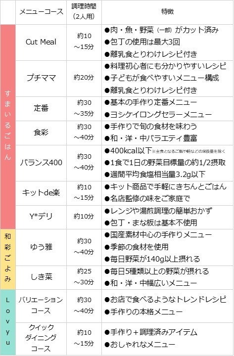 家族との暮らし方や働き方が多様化し、食卓環境も大きく変化を遂げている中、ヨシケイでは様々なニーズにこたえるため11ものメニューコース※をご用意。各家庭での生活スタイルに合わせたものをお選びいただけます。