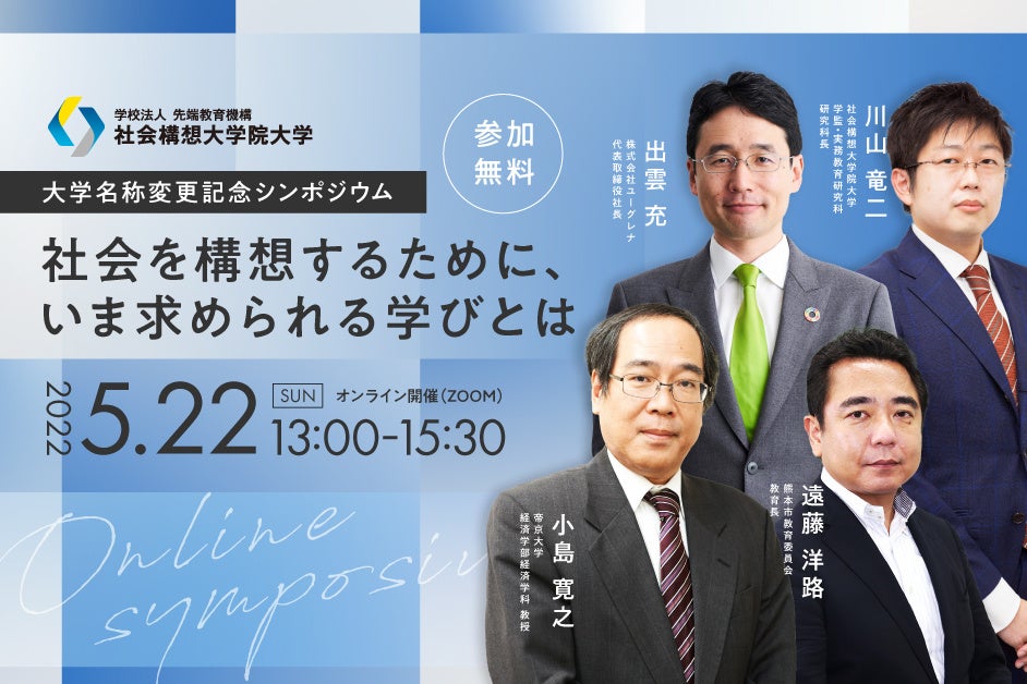 社会人向け総合専門職大学院 社会構想大学院大学(学校法人先端教育機構、東京都新宿区、学長:吉國浩二)は、2022年5月22日に「社会を構想するために、いま求められる学びとは」をテーマに校名変更記念シンポジウムをオンラインにて開催します。