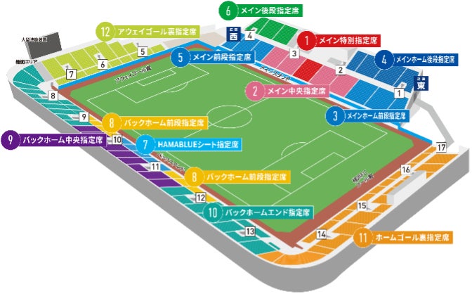 ⑪ホームゴール裏、バックホーム前段、 ⑨バックホーム中央、⑩バックホームエンド |