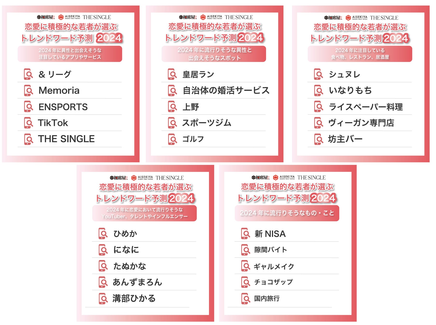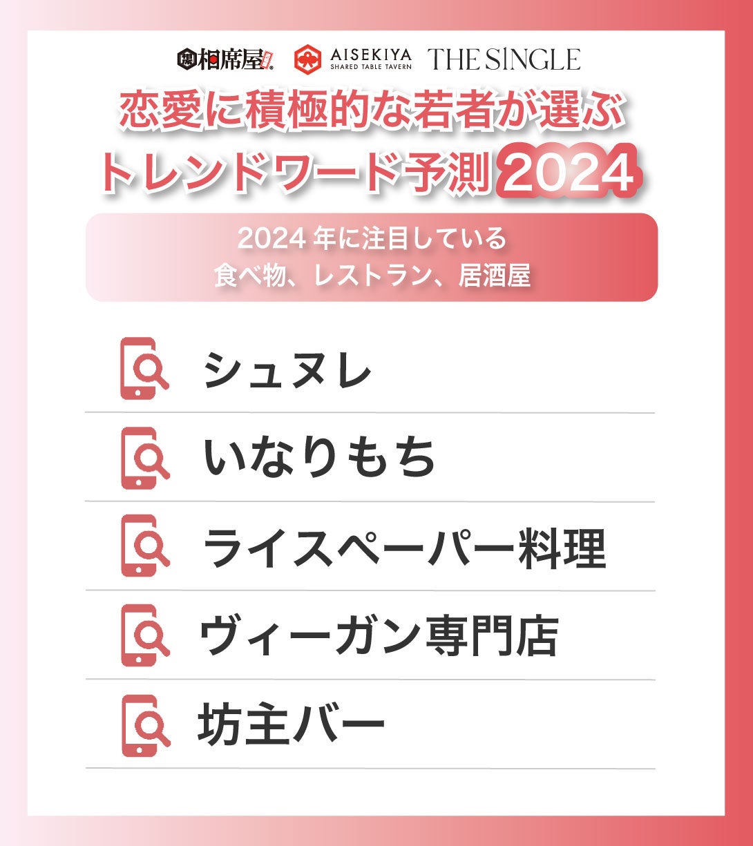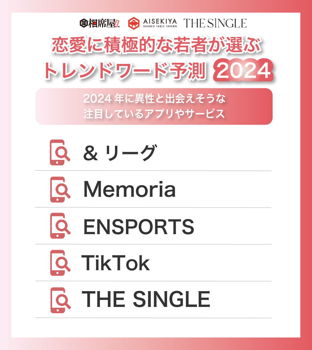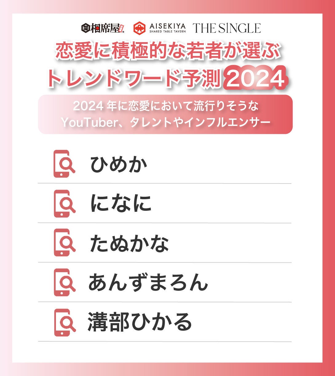 彼氏が欲しい肉食女子が選ぶ2024年度に注目しているアプリ、出会いのスポット、食べ物、YouTuberを発表。