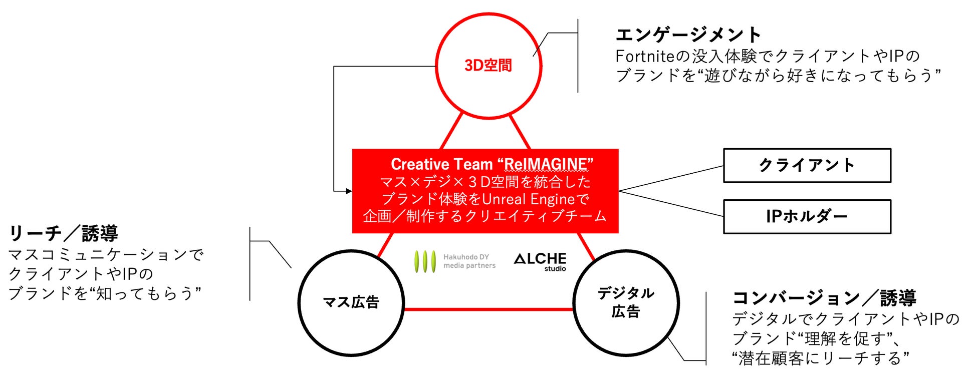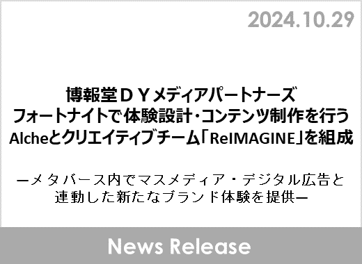 株式会社博報堂DYメディアパートナーズ(本社:東京都港区、代表取締役社長:矢嶋弘毅、以下 博報堂DYメディアパートナーズ)は、ゲーム開発のためのリアルタイム3D制作ツールUnreal Engineを活用したコンテンツ制作に強みを持ち、バーチャルライブやゲーム制作などを行うAlche株式会社(アルシェ、本社:東京都渋谷区、代表取締役社⻑:川 ⼤揮、以下 Alche)と、オンラインプラットフォーム「フォートナイト」を活用しブランドやIPの世界を体験できるコンテンツ企画・制作を行うクリエイティブチーム「ReIMAGINE」を組成しましたので、お知らせいたします。