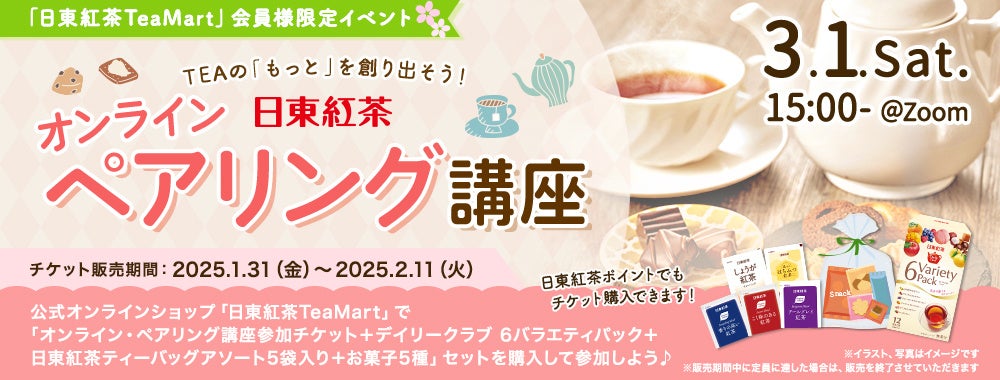 日東紅茶ブランドを展開する、三井農林株式会社(所在地:東京都港区 代表取締役社長:佐伯 光則 以下、当社)では、日東紅茶TeaMart会員の皆さまと紅茶を楽しむ「日東紅茶 オンライン・ペアリング講座」を開催いたします。本講座では、紅茶と食べ物のペアリングのポイントやティーバッグのおいしい淹れ方をご紹介し、日東紅茶商品を淹れて一緒にお菓子とのペアリングをお好きな場所※で楽しんでいただけるイベントです。みなさまのご参加をお待ちしております。