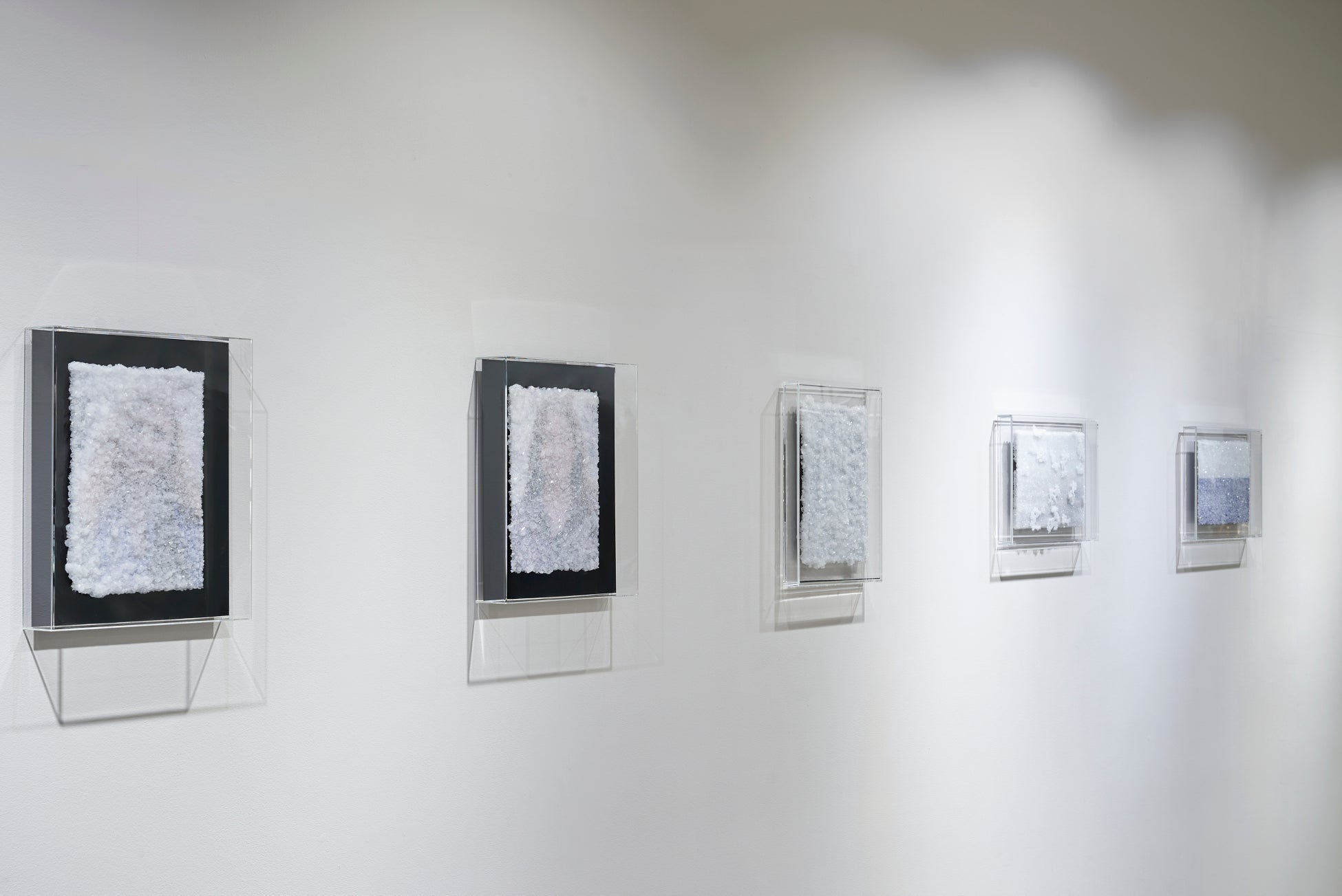 田中は、液体が時と共に⽴体へと変化していく結晶化の⾃然現象を表現媒体とし、消えゆく瞬間を可視化します。振動や音もまた結晶の触媒として機能し、時間と共に失われるはずの存在が作品に永遠に封じ込められ、私たちの前に現前するのです。