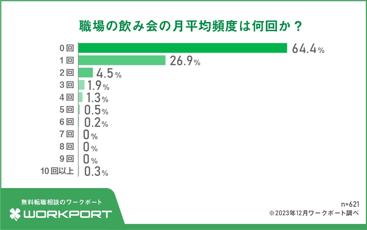 さらに、対象者全員に職場の飲み会の月平均頻度は何回か聞いたところ、「0回」が64.4%で最多となりました。次いで、「1回」が26.9%でした。過去には飲みニケーションを重視する風潮から高頻度で仕事終わりの飲み会が行われていた時代もありましたが、現代では基本的に飲み会をしない職場が多く、実施している職場でも月1回程度と頻度は低いようです。