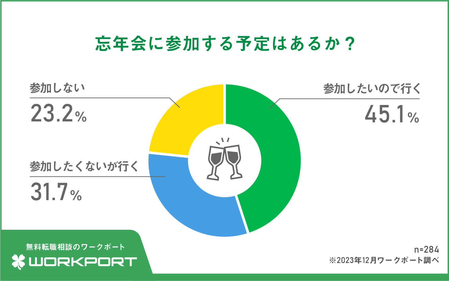 続いて、今年職場で忘年会の開催予定があると回答した人に、参加する予定はあるか聞いたところ、「参加したいので行く」(45.1%)、「参加したくないが行く」(31.7%)とする参加派が76.8%となり、「参加しない」と回答した人が23.2%でした。望んで参加する人が半数近くいる一方で、仕方なしに参加する予定の人も3割ほどいることが明らかになりました。