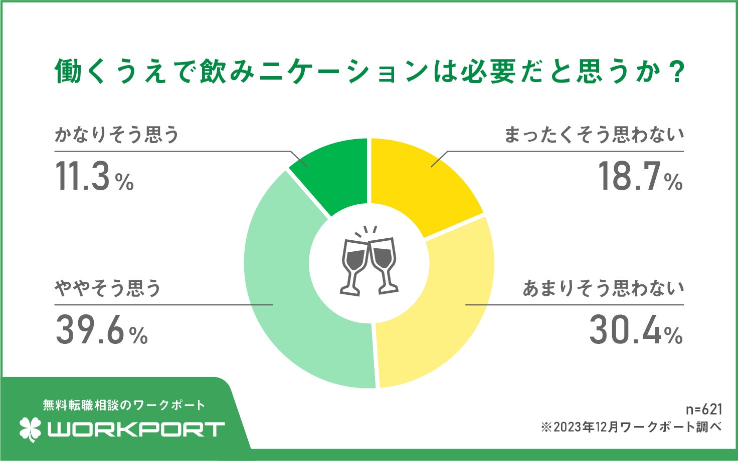 最後に、対象者全員に働くうえで飲みニケーションは必要だと思うか聞いたところ、「かなりそう思う」(11.3%)、「ややそう思う」(39.6%)とする必要派が合わせて50.9%となり、「まったくそう思わない」(18.7%)、「あまりそう思わない」(30.4%)とする不要派が合わせて49.1%でした。
