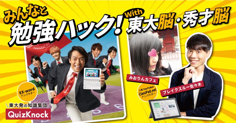 今回のキャンペーンでは、電子辞書“EX-word(エクスワード)”公式アカウントのフォロワーを対象に、オリジナルの勉強ハック・勉強術、勉強の裏技をハッシュタグ「#みんなと勉強ハック」で募集します。独創的でユーモラスなアイデアを投稿した10名様には、最新の“EX-word”やオンライン学習プラットフォーム「ClassPad.net(クラスパッド ドット ネット)」の無料ライセンス、時計といった当社製品をプレゼントします。また、本キャンペーンを通じて、教育系の人気インフルエンサーがおすすめする勉強ハックも発信。QuizKnockメンバーによる“EX-word”活用方法紹介のほか、ブレイクスルー佐々木・みおりんカフェからは独自の勉強術が公開されます。