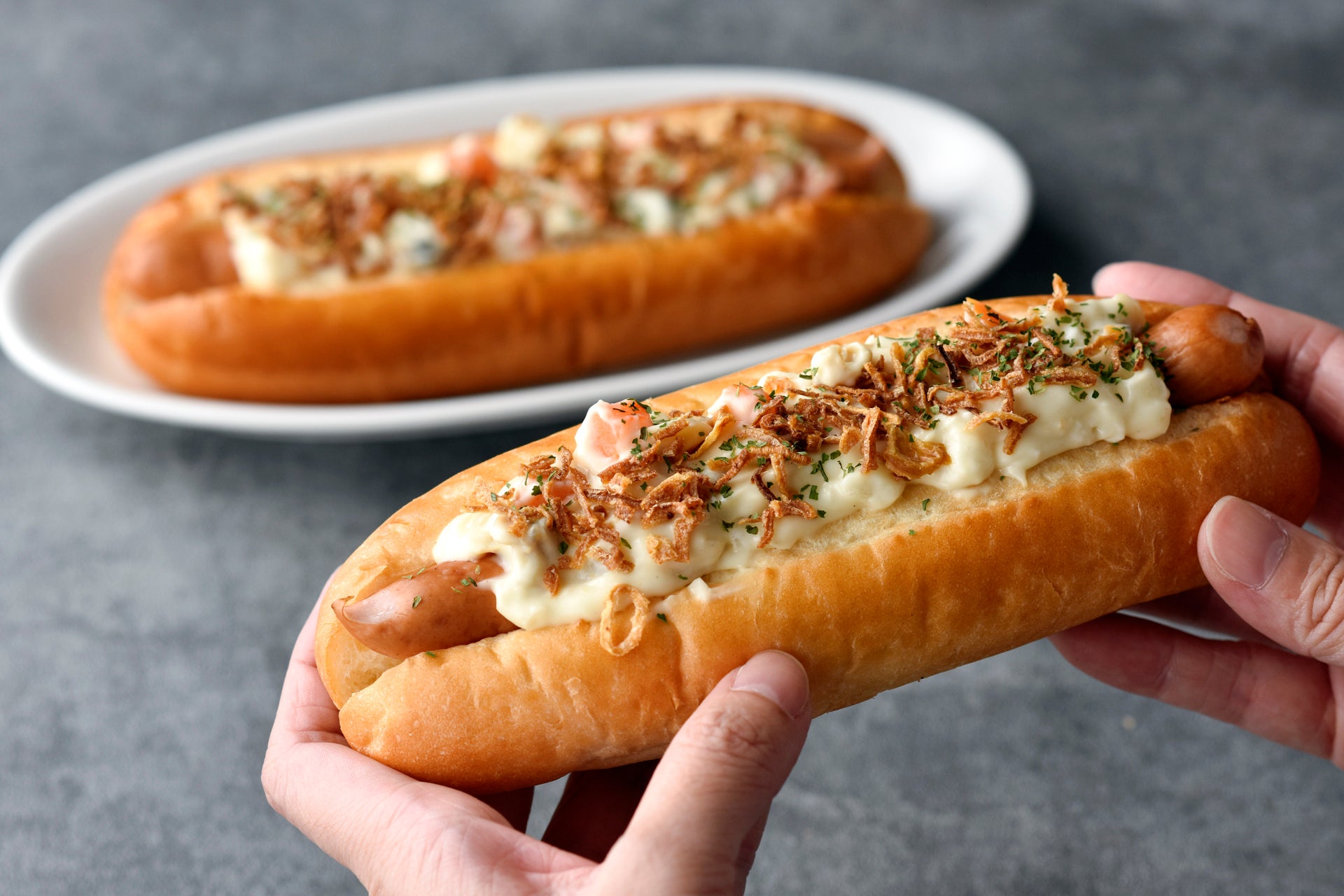 さくっと焼き上げたドッグパンに食べ応えのあるソーセージを挟み、魚介の風味が楽しめるクラムチャウダーソースをかけて冬らしく仕上げました。カリカリのフライドオニオンがアクセントになっています。ぜひご賞味ください。