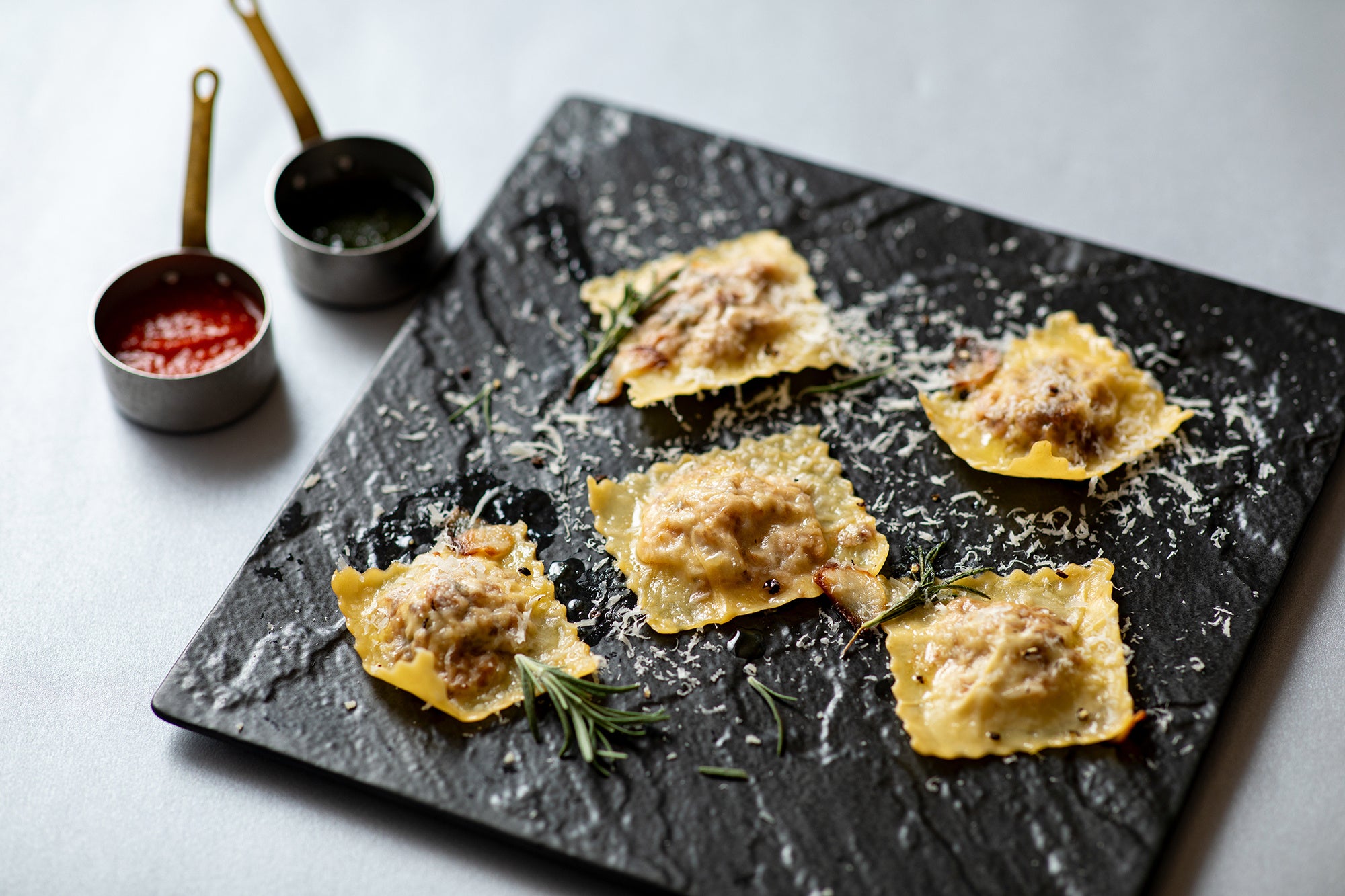えんどう豆のたんぱく質を主原料とした代替肉の“ビヨンドビーフ”を使用したラビオリを、トマトとホテル内の営業外スペースを利用し土を使わず水耕栽培で作ったスイートバジルを使ったバジルソース、2種のソースでお楽しみいただきます。自身の想いでもある「お肉を使わずとも満足度の高い一皿」に仕上がっており、最後まで飽きることのない一品です。