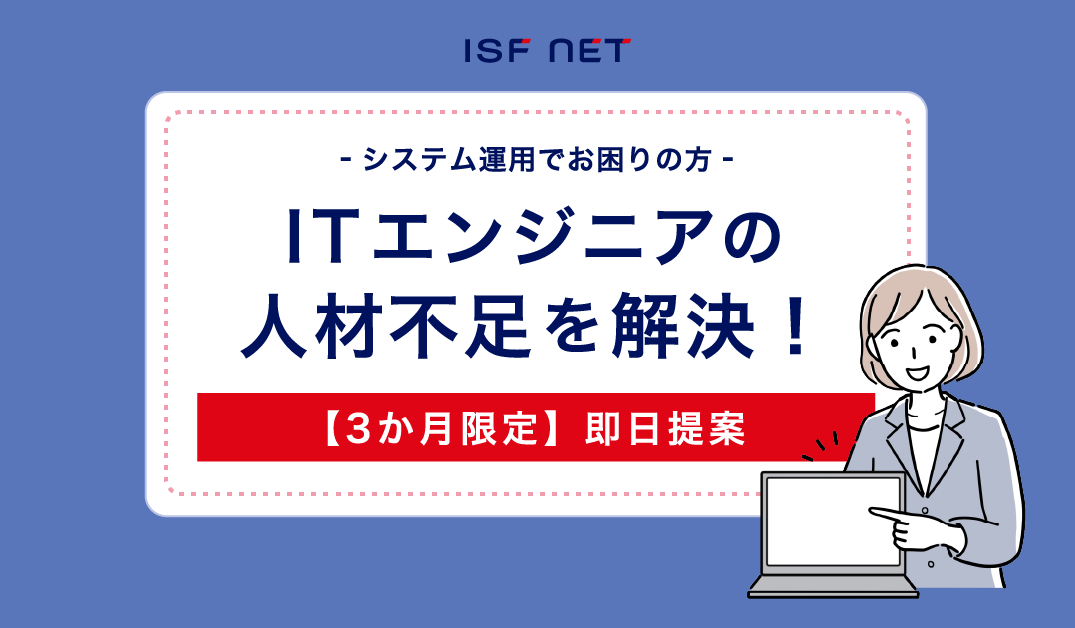株式会社アイエスエフネット(本社:東京都港区、代表取締役:渡邉幸義)は、2023年4月から6月の期間、情報システム運用に関する業務を一気通貫でサポートする、「ITインフラエンジニア派遣サービス」を強化いたします。