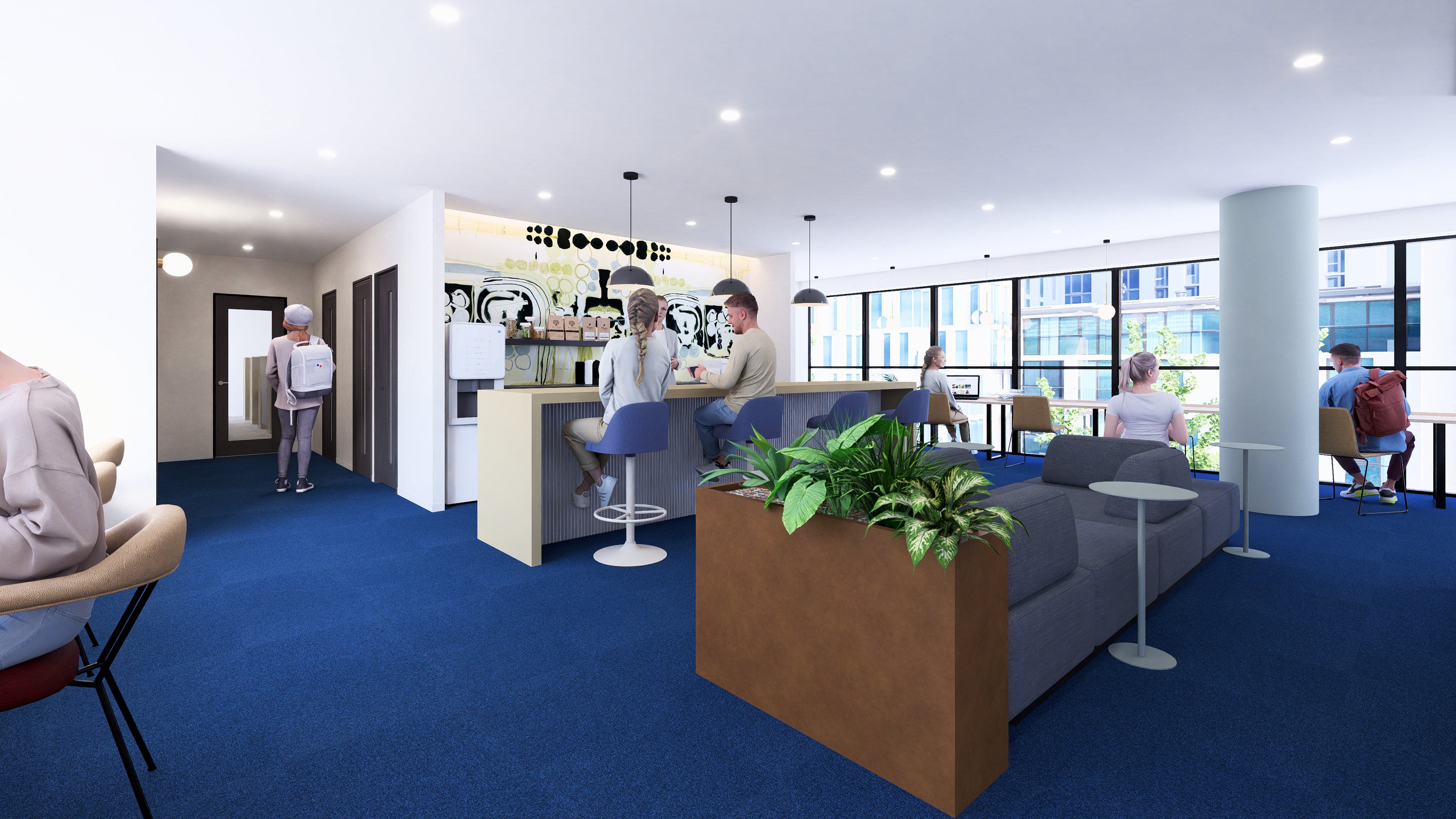 東京メトロ東西線、高田馬場駅から徒歩1分に位置する当施設は、テレワークだけでなく、通勤前後の隙間時間にも立ち寄れる立地です。国際色豊かな人や街の光景を演出したウォールアートやガラス面には、当施設を訪れる人々にとって豊かなサードプレイスを目指したいというデザイナーの思いが込められています。