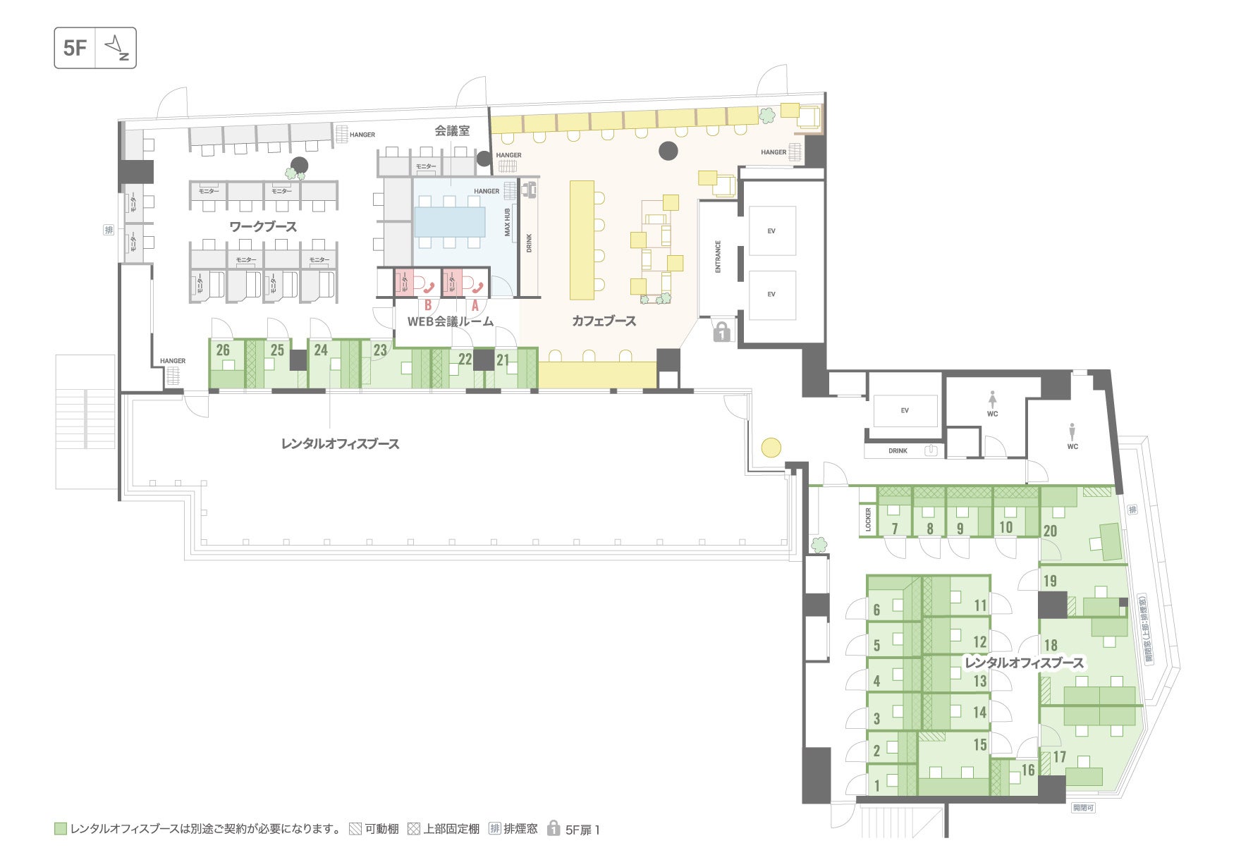 設備:Wi-Fi、フリードリンク、無料プリンター、ロッカー、ポスト、登記可、会議室、WEB会議ルーム