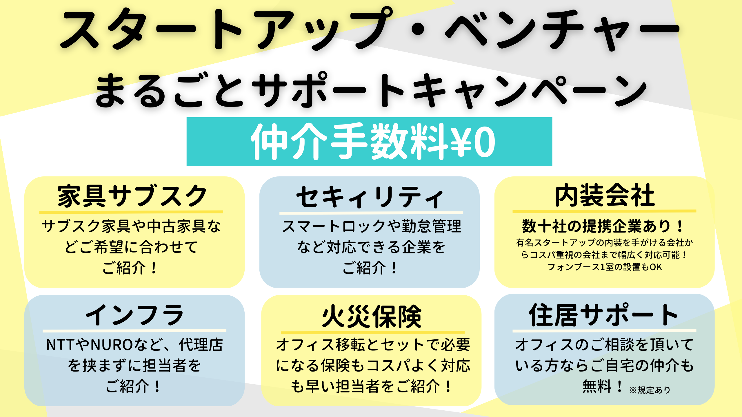 「VCパッケージ」の利用には、アニマルスピリッツを含む提携ベンチャーキャピタルを介して弊社にご紹介いただいた場合を対象としております。提携ベンチャーキャピタルから出資を受けている企業でオフィス移転を検討されている場合は、ベンチャーキャピタルに「オフィス移転を検討している」旨をお伝えください。