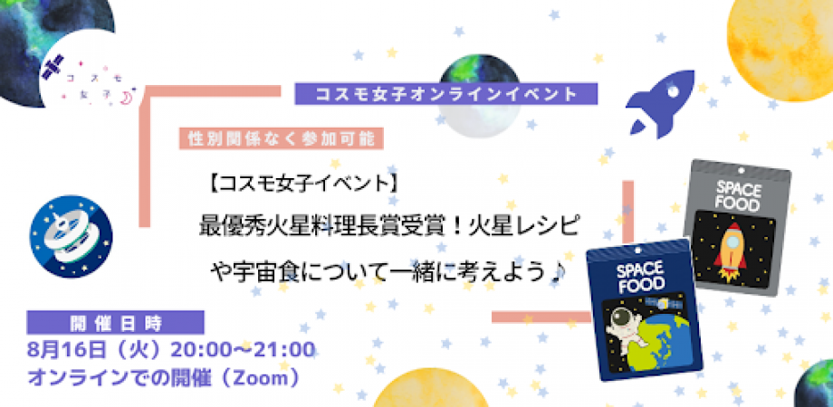 株式会社Kanatta(東京都目黒区、代表取締役社長:井口恵)が運営する【コスモ女子】は、8月16日(火)に最優秀火星料理長賞を受賞したコスモ女子メンバーが登壇し、クイズ形式で「火星レシピ」と「宇宙食」について考えるイベントを開催します。