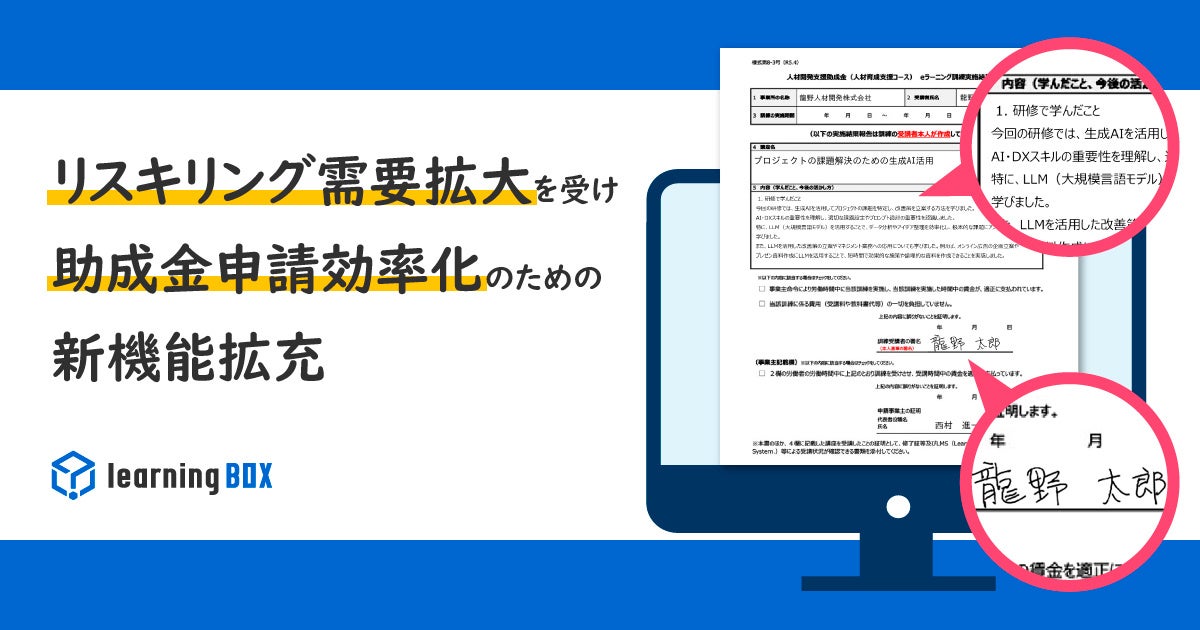 リスキリング需要拡大を受け、助成金申請効率化のための新機能拡充 eラーニングシステム「learningBOX」