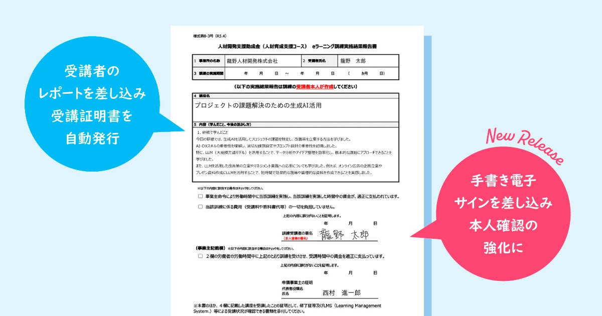 「手書き電子サインを学習修了証へ自動挿入する機能」「受講履歴の一括出力を効率化する機能」拡充でリスキリング事業者の人材開発支援助成金申請DX化を促進