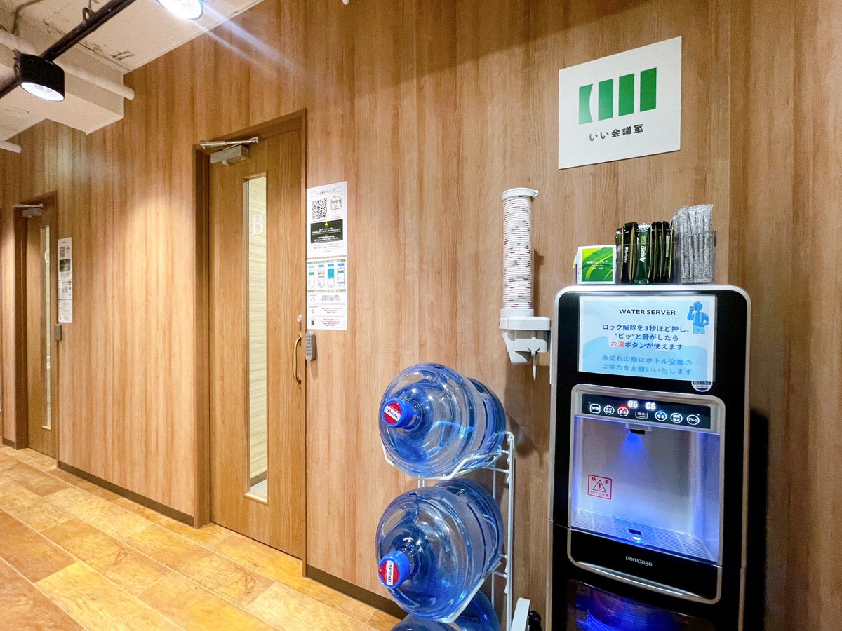 店内には、フリードリンクコーナーも設置。近くのコンビニで会議の出席者用ドリンクを用意する必要なく、ご利用いただけます。