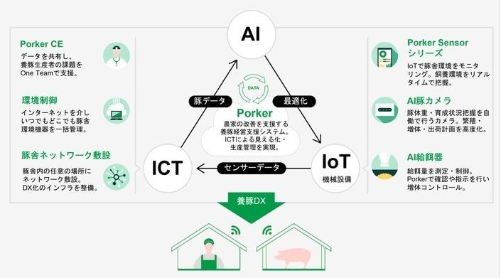 Eco-Porkは、養豚事業者向けに、AI・IoT等のデータ技術を活用した生産管理システムの開発・提供をしています。農場作業の進捗や飼養状況を管理・データ化する養豚経営支援システム「Porker」や、豚舎の温湿度・給水設備、豚の様子等を遠隔でモニタリングできる「Porker Sensor シリーズ」、複数豚の一括体重測定「AI豚カメラ」等を開発し、これらを組み合わせることで現場の省力化を図り、養豚業の生産性向上を支援しています。