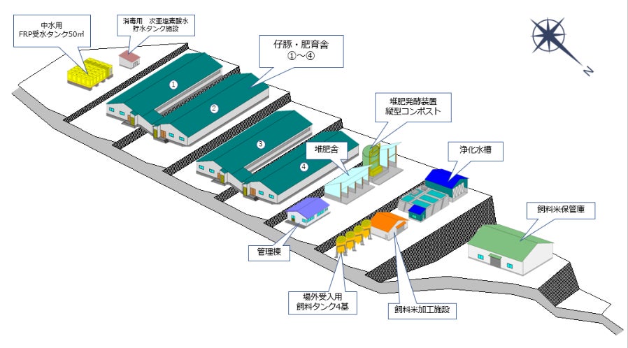 豚舎の建設に木造建築を採用し、太陽光発電を設置するほか、飼料において、店舗や食品工場の残渣の活用や、豚糞を施設内で堆肥化して飼料米の肥料に利用するなど、環境に配慮した循環型施設を目指します。