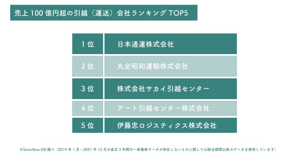 【SalesNow DBレポート】引越(運送)会社、売上100億円以上の企業ランキングを公開