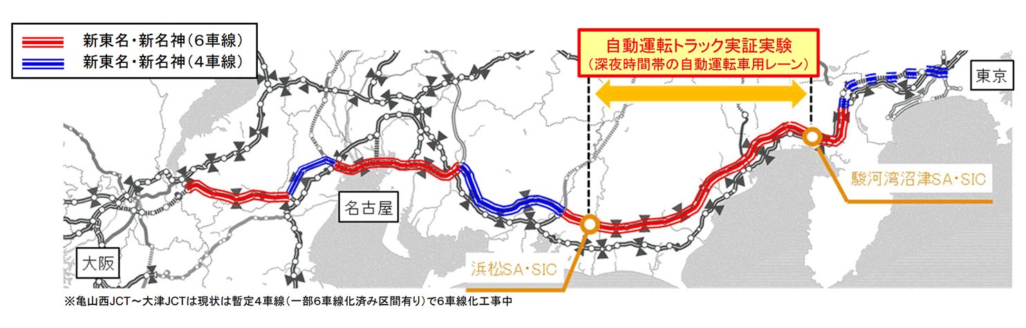 政府の「デジタルライフライン全国総合整備計画」(2024年6月)の中で、2024年度以降、新東名高速道路の一部区間(駿河湾沼津SA~浜松SA:約100km)において、関係府省庁連携で自動運転レベル4トラックの実現に向けた実証実験を実施することが決定しました。現在、新東名高速道路の一部区間での自動運転レベル4トラックの先行社会実装を目指し、自動運転レベル4に関連した多くの実証実験が行われています。