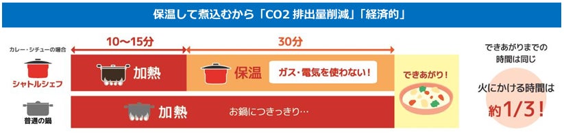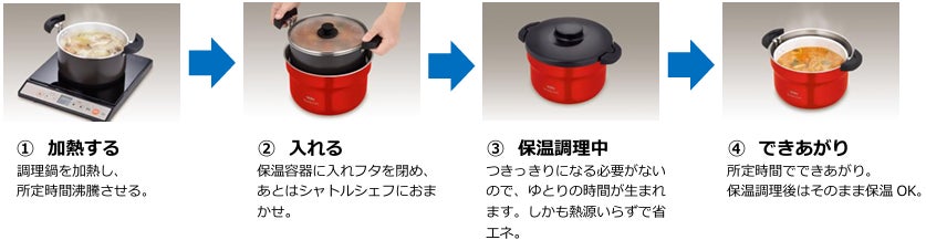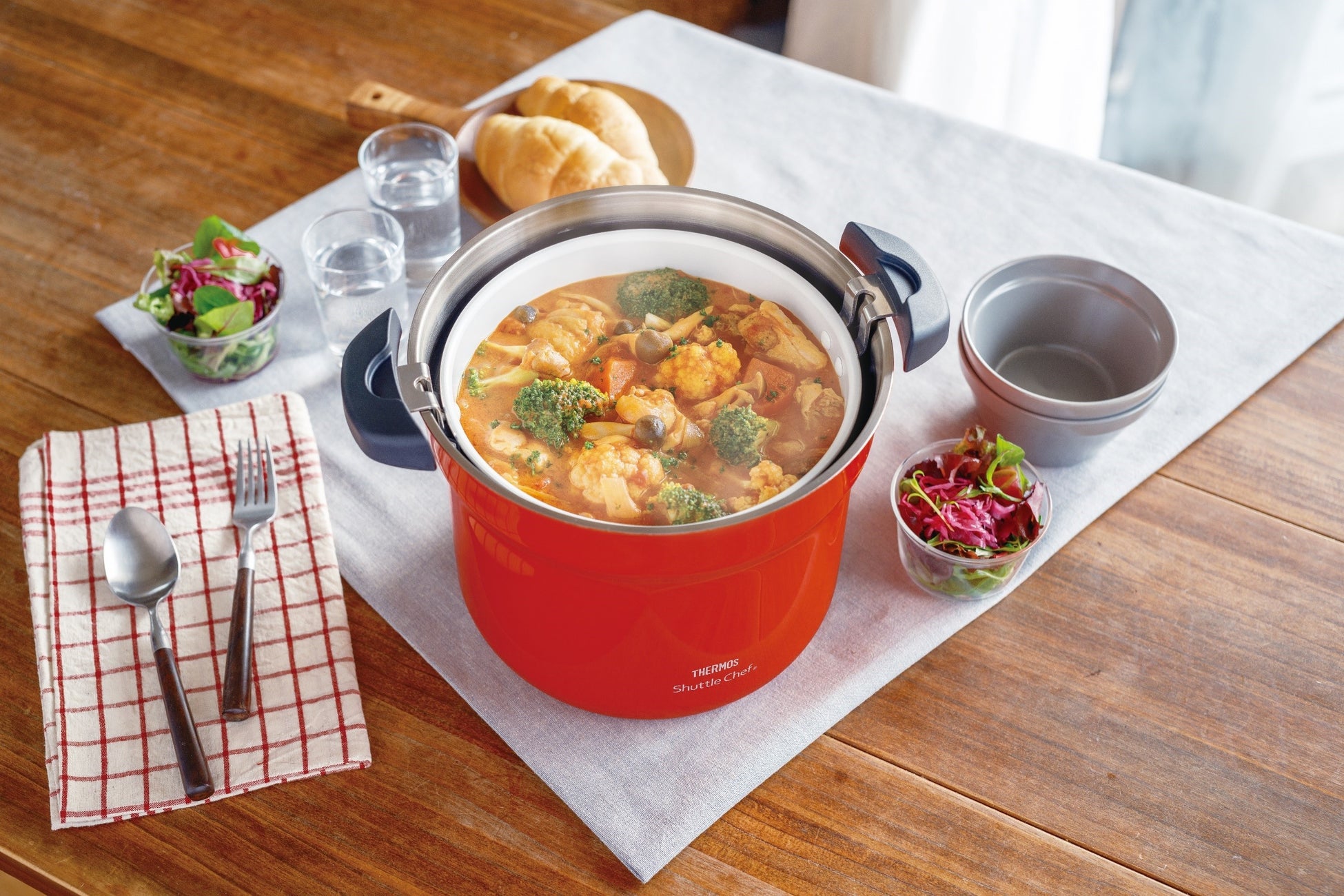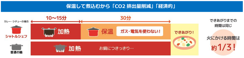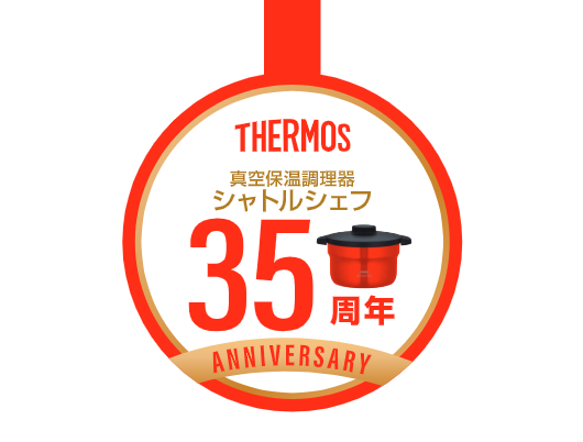 『サーモス 真空保温調理器シャトルシェフ』は、今年で発売から35周年を迎えた当社のロングセラー製品です。本製品は、短時間火にかけた調理鍋を保温容器で丸ごと保温し、余熱で食材に火を通す「保温調理」ができる調理器具として、発売以降長年に渡って愛されてきました。サーモスが培った真空断熱技術により、鍋に火をかけ続けることなく余熱でじっくり煮込むので、煮くずれせず、素材本来の風味や旨みを生かしながら味をしみこませることができます。保温調理中はガスや電気を使わず、コンロにつきっきりになる必要がないので、省エネ&手間が省けます。さらに、保温して煮込むことでCO2削減に貢献できる地球にやさしいアイテムです。