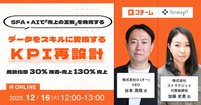 株式会社ストラテジット(本社:東京都港区、代表取締役社長:加藤 史恵、以下当社)は、株式会社O:(オー)(所在地:東京都中野区、代表:谷本 潤哉、以下「オー」)と共催で、2025年12月16日(火)12:00〜13:00に、営業成果向上をテーマとした無料オンラインウェビナーを開催いたします。