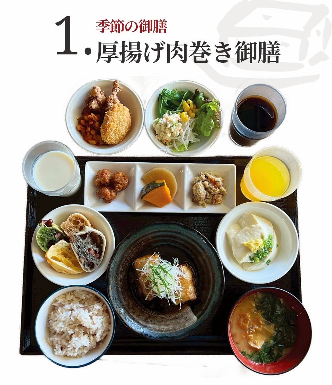 ・バイキング付: 御膳には、自慢の豆腐料理や旬の惣菜の食べ放題、さらに「しぼりたて濃厚豆乳」などのドリンク飲み放題がセットになっています。