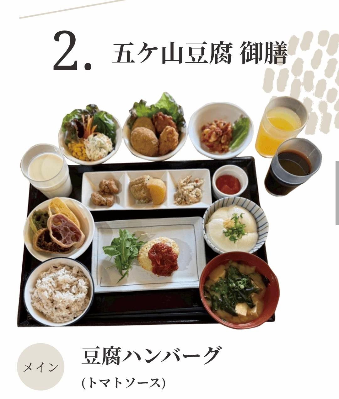 ご好評いただいているバイキングは、益々充実したラインナップ!五ケ山豆腐自慢のこだわりの豆腐はもちろんのこと、お子様から大人まで大人気の鶏の塩麹唐揚げ、 豆乳クリームコロッケ、そして大人気の豆乳もっちりんも食べ放題です!さらに、 自家農園の新鮮野菜サラダに、ドリンクコーナーにはしぼりたての濃厚な豆乳に加えおから茶とオレンジも飲み放題、食後のひとときをより一層豊かにします。そしてグルテンフリー二十雑穀米も嬉しい食べ放題、出汁からとった美味しい味噌汁もおかわり自由です。このバイキングメニューが3つの御膳とキッズメニューに付帯します。