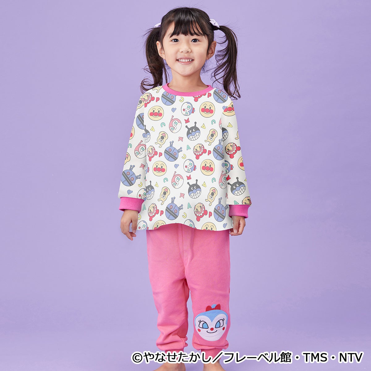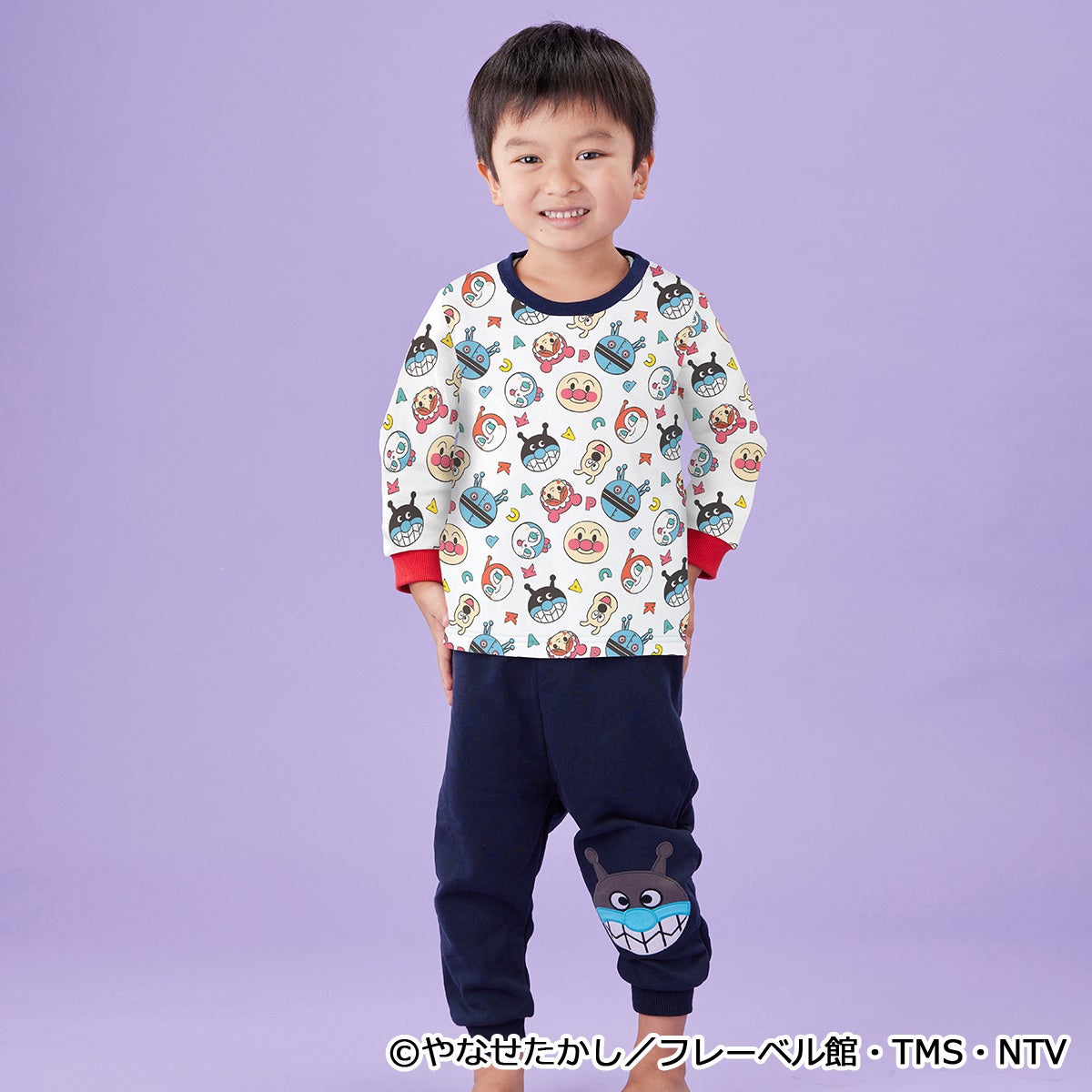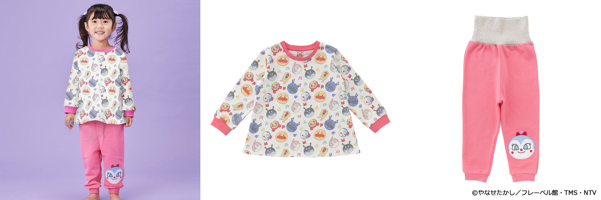 トップスはアンパンマンやなかまたちのお顔がかわいい総柄デザインとなっており、ボトムスはブルーにはばいきんまん、ピンクにはコキンちゃんのアップリケがそれぞれついています。