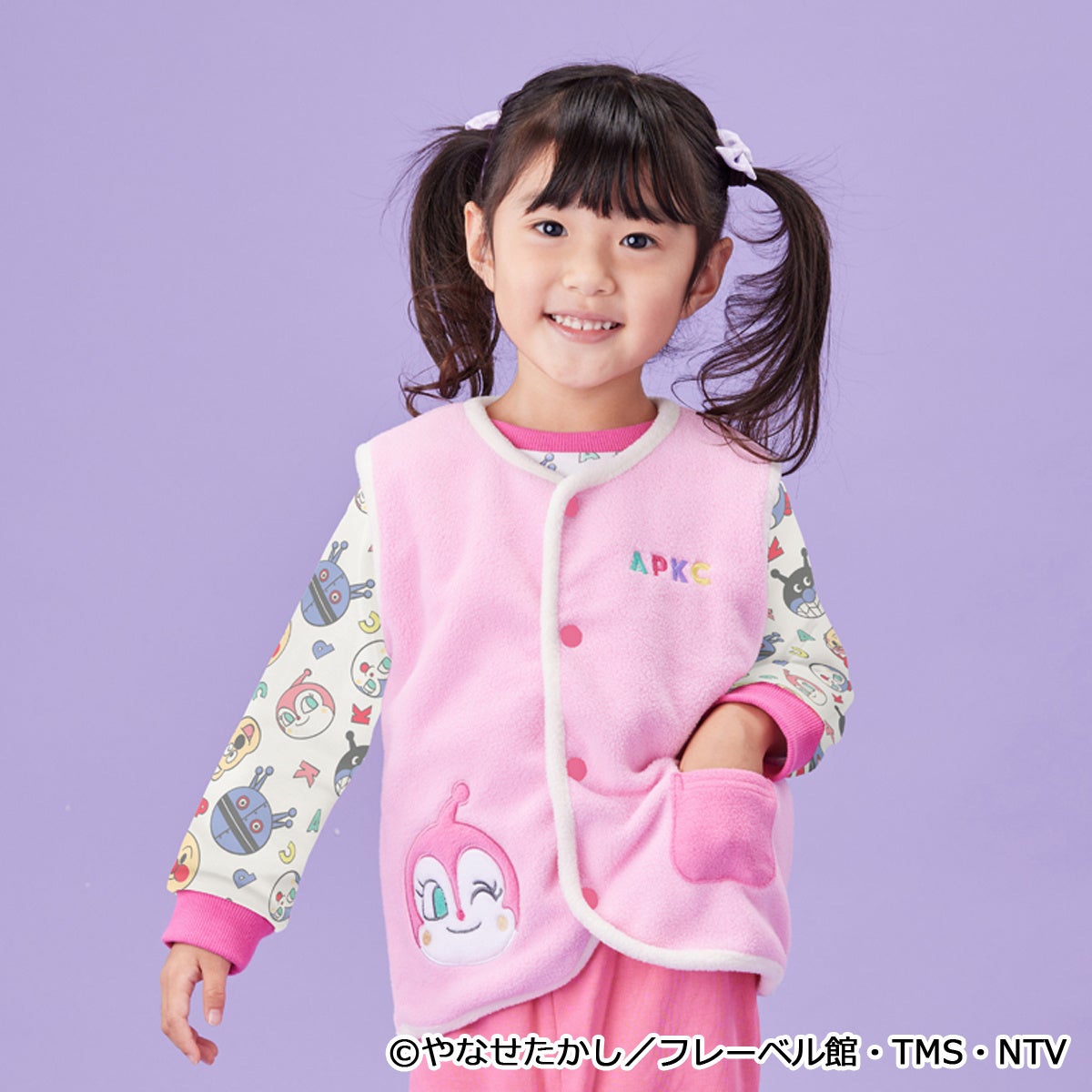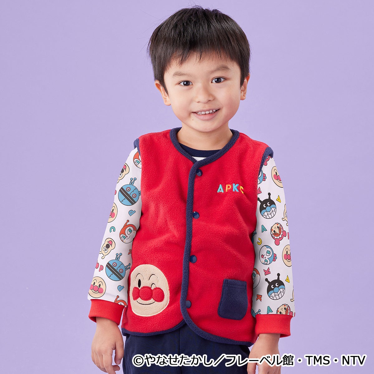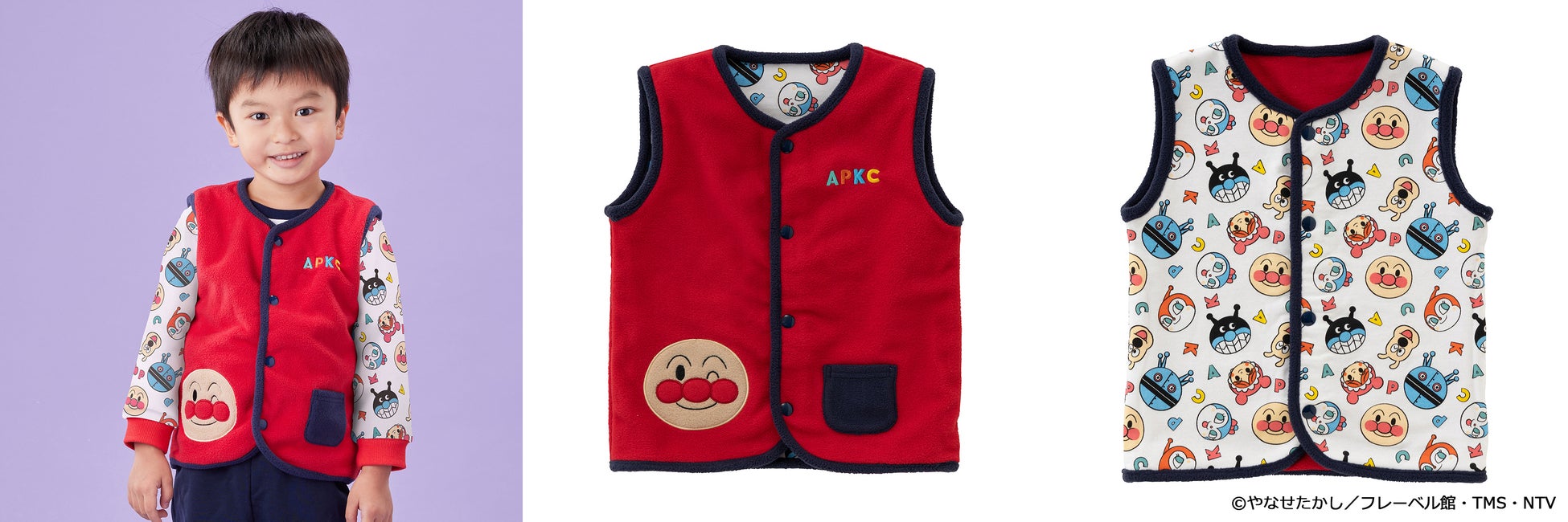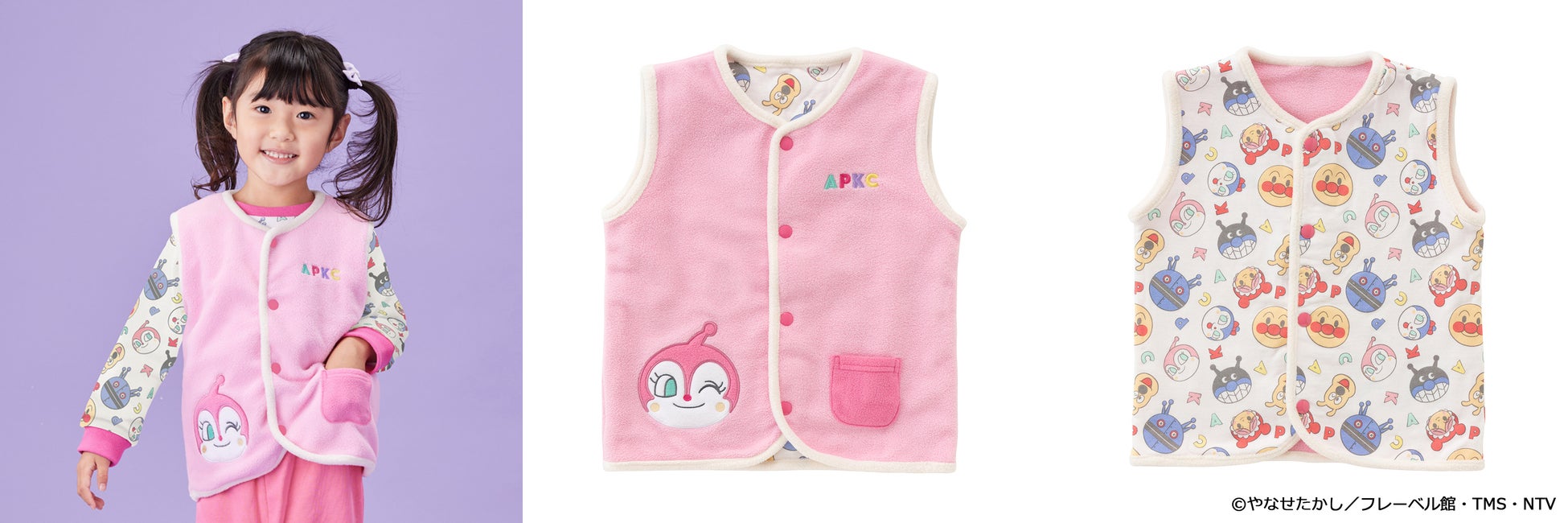 トップスはアンパンマンやなかまたちのお顔がかわいい総柄デザインとなっており、ボトムスはブルーにはばいきんまん、ピンクにはコキンちゃんのアップリケがそれぞれついています。