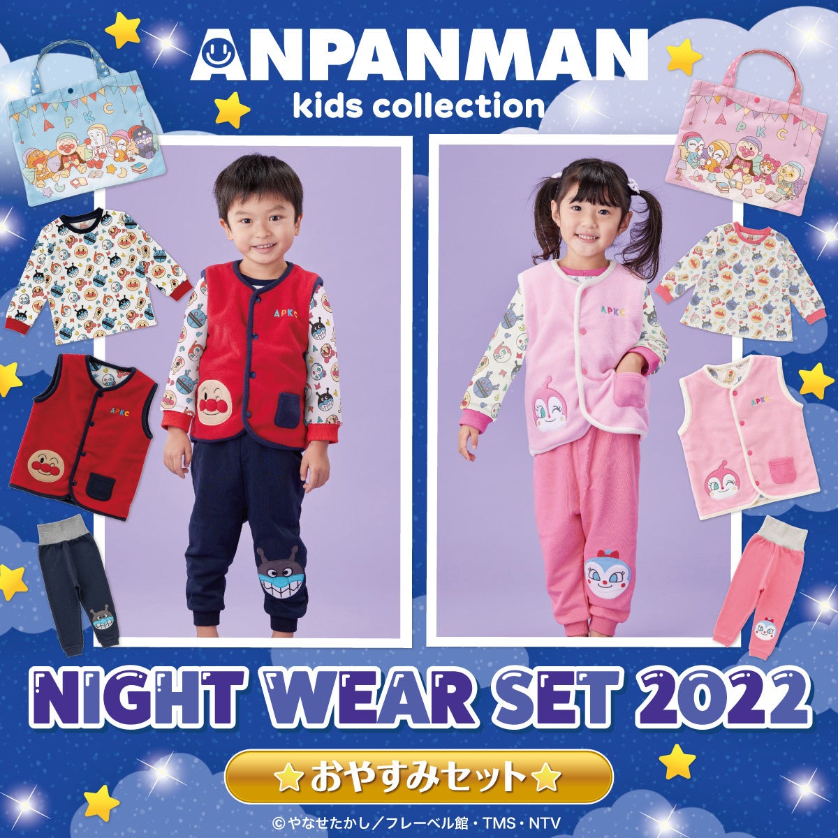 株式会社バンダイ ファッションブランド事業部では、子どもたちに人気のテレビアニメ「それいけ!アンパンマン」の子ども服ブランド「アンパンマンキッズコレクション」より、前年も好評だったセット内容はそのままに、より仕様にこだわった『おやすみセット』全2カラー(各7,777円 税込)を2022年11月11日(金)より順次販売いたします。(発売元:株式会社バンダイ)
