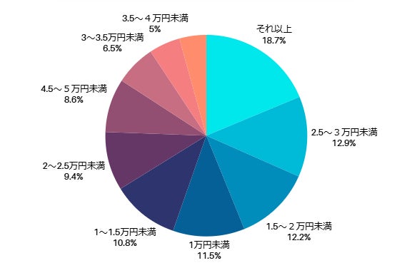 学生のクレジットカードの毎月の利用額は5万円以上が最も多く、それ以外はおおむね同率の結果となった。