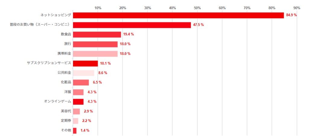 学生がクレジットカードを利用するのはネットショッピングが84.9%でもっとも多く、次に普段のお買い物(スーパー・コンビニ)が47.5%と続いた。
