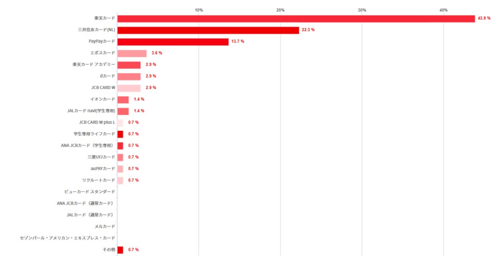 楽天カードが43.9%で最も多く、三井住友カード(NL)が22.3%でこれに続いた。また、PayPayカードが13.7%で票を集めた。