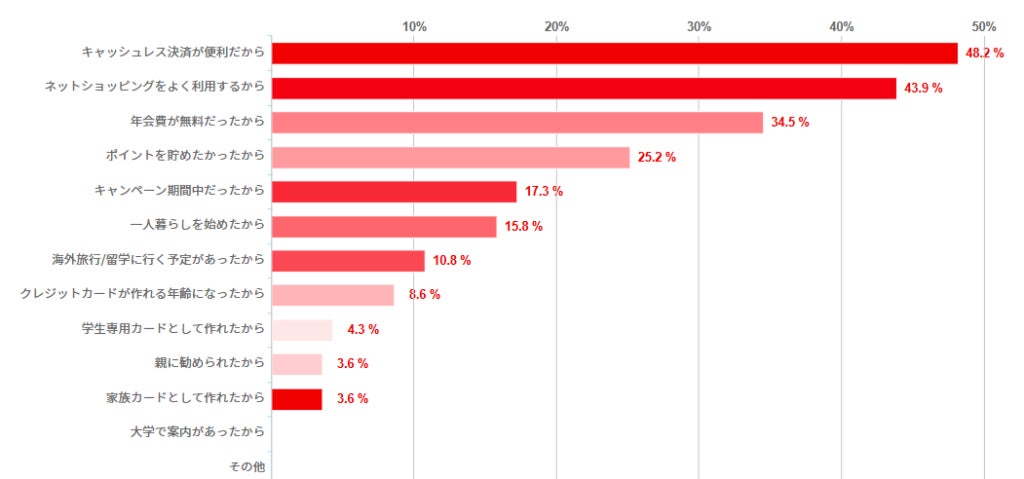 学生がクレジットカードを作るきっかけとしては、「キャッシュレス決済が便利だから」が48.2%で最も多く、「ネットショッピングをよく利用するから」が43.9%でこれに続いた。また、「年会費が無料だったから」も34.5%で3番目に多かった。