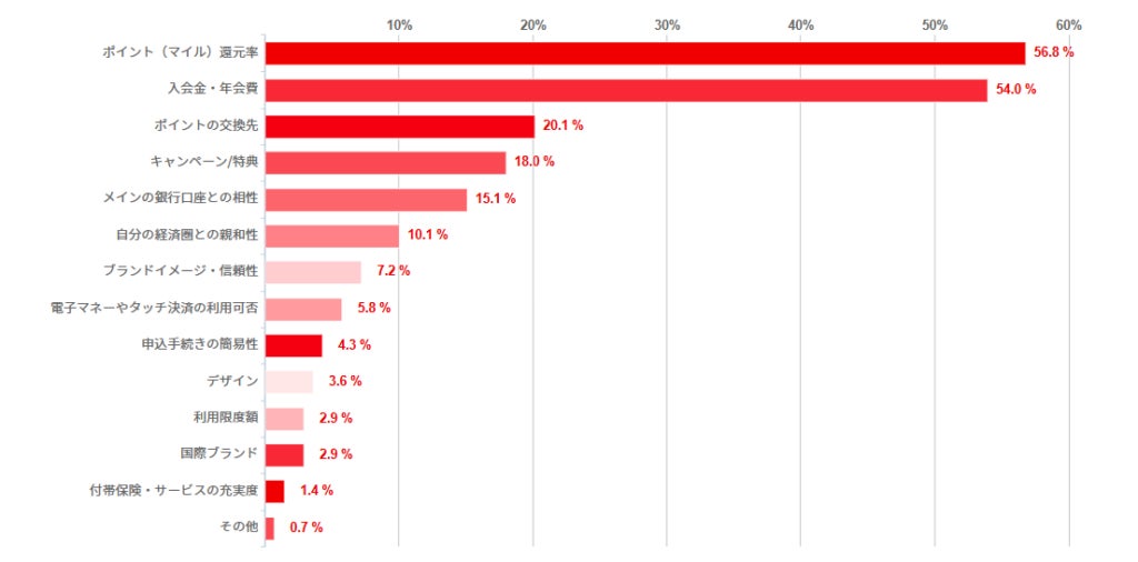 「ポイント(マイル)還元率」、および「入会金・年会費の安さ」を重視している人が圧倒的に多数という結果になった。なお、その他には「ポイントの交換先」や「キャンペーン・特典」を選ぶ人も多かった。