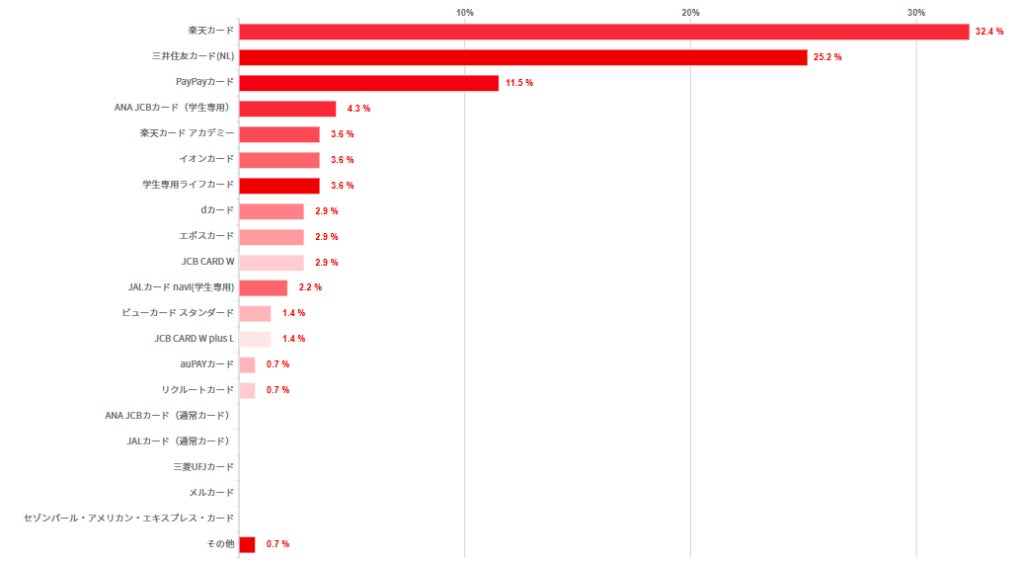 楽天カードが32.4%で最も多く、三井住友カード(NL)が25.2%でこれに続いた。また、PayPayカードが11.5%で票を集めた。