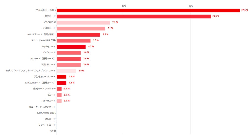 三井住友カード(NL)が27.3%で最も多く、楽天カードが23.0%でこれに続いた。また、JCB CARD Wが7.9%で票を集めた他、エポスカードやANA JCBカード(学生専用)も一定数の回答があった。