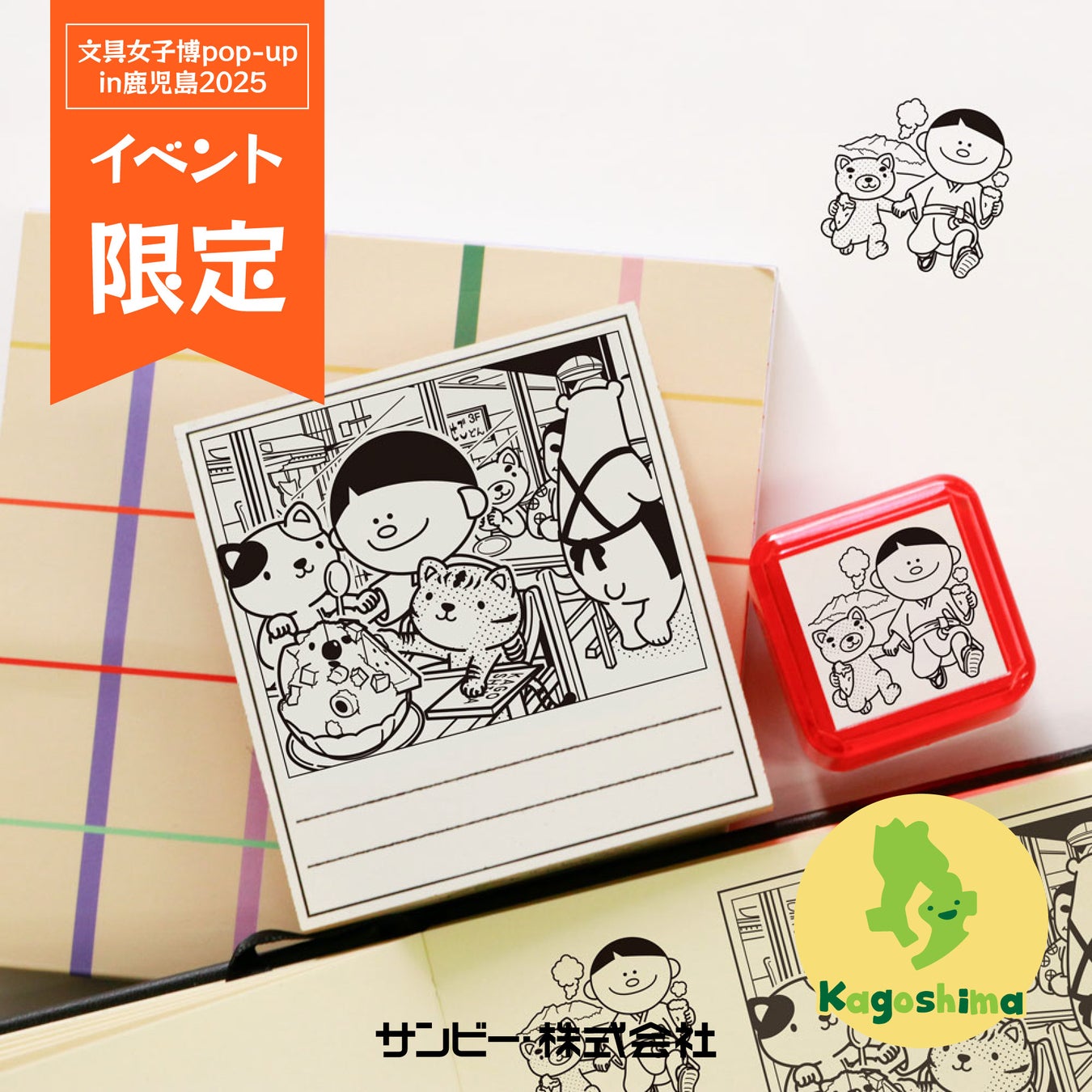 サンビーぼうやイベント限定スタンプにご当地絵柄が新登場!鹿児島と言えば!あの方になりきりサンビーぼうや&わんちゃんの浸透印と、いつものなかまたちと「しろくま」を食べにいくサンビーぼうや。手帳やカードにピッタリのスタンプです。
